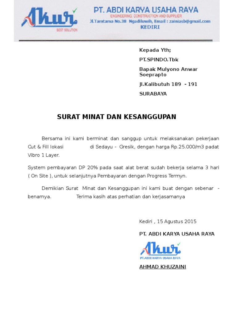 Contoh Surat Minat Letter Of Intent / Penerbitan surat minat atau lebih dikenal dengan letter of intent (loi) bertujuan untuk menunjukkan komitmen seseorang atau perusahaan tertarik atau berminat terhadap sesuatu hal dalam bisnis, baik untuk membeli, untuk ikut berpartisipasi dalam suatu bisnis atau keinginan apapun dari suatu entitas.. A letter of intent (loi or loi, and sometimes capitalized as letter of intent in legal writing, but only when referring to a specific document under discussion) is a document outlining the understanding between two or more parties which understanding they intend to formalize in a legally binding. A letter of intent (also known as a statement of purpose or a motivation letter ) is a document where you describe your professional competence and personal motivation about choosing to study a particular study field at a particular university. Dengan ketentuan sbb demikian surat perintah kerja ini kami buat selanjutnya kami menunggu kedatangan bapak di surabaya untuk penandatanganan mou. Schuettlaw.com this letter is written in to award someone a contract of construction. Dengan ini kami sampaikan minat dan keseriusan untuk menyewa dump truck hino untuk proyek pengangkutan batubara di.