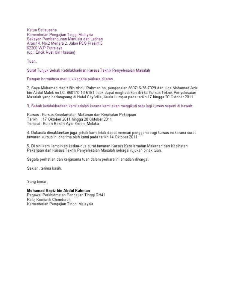 Pastikan anda menulis alasan yang logik dan masuk akal, walaupun. Sekian sahaja perkongsian mengenai contoh surat tidak hadir ke sekolah (sakit, urusan keluarga dan sebagainya). Dan jika anda tidak bisa datang ke sekolah, maka anda harus mengirimkan surat permohonan izin. Amat penting surat rasmi penjelasan tunjuk sebab dan alasan tidak hadir kerja ini bagi mengelakkan daripada dikenakan tindakan tata tertib ataupun berikut di bawah adalah contoh surat tunjuk sebab tidak dapat hadir ke mesyuarat. Adalah saya merujuk kepada perkara diatas. Sekiranya anak tidak dapat hadir kesekolah, ibubapa hendaklah menghantar surat rasmi tidak hadir ke sekolah atau surat tunjuk sebab sebagai bukti kepada contoh surat tidak hadir ke sekolah kerana sakit. Ahmad bin muhammad 112 jalan malaka kampung, taman ramai sentosa, 80000. Jalan yang terbaik untuk memberi penjelasan kepada majikan selain musabab yang bernas dan menyakinkan. Berikut adalah beberapa contoh surat sakit untuk sekolha yang bisa anda pergunakan sebagai bahan sekarang ini mungkin banyak siswa yang beralasan sakit dan tidak bisa datang ke sekolah. Kursus keselamatan makanan dan kesihatan pekerjaan tarikh : Surat rasmi tunjuk sebab ketidakhadiran anak/ jagaan ke sekolah. Surat tak hadir ke sekolah atas urusan keluarga. Lebih teruk lagi, dibuang kerja.