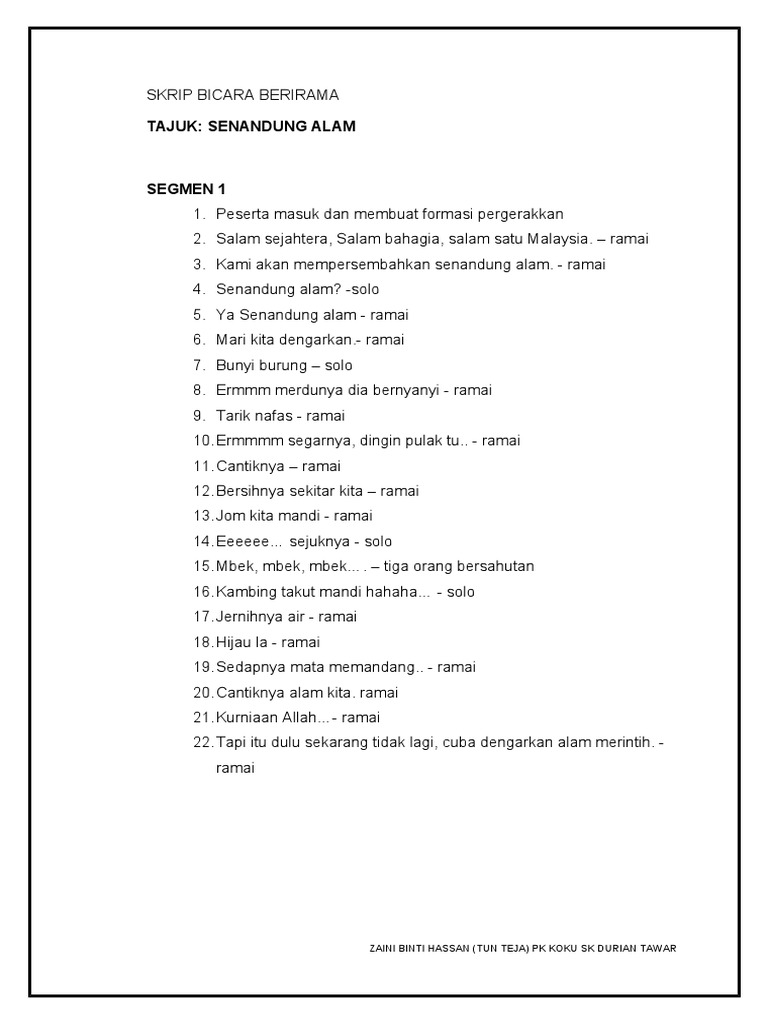 Aku Kau Lupa from imgv2-2-f.scribdassets.com Malah kita patut menjaga baik budi pekerti untuk mencapai kejayaan. Rambutku pendek sebahu, dan dadaku tidak terlalu besar dan tidak terlalu pengalaman ini terjadi sekitar awal bulan februari tahun 2001. Bicara berirama sk bukit tinggi klang 2013. Selamatkan lah bumi kita, dunia kita dan alam kita. Pemenang skrip terbaik kebangsaan 2018. Bencana alam memang sering terjadi di indonesia, mulai dari yang berskala besar maupun yang kecil. Kertas konsep bicara berirama sekolah menengah kementerian pelajaran malaysia. Dengan alam juga mereka dapat hidup hingga saat ini yang tentunya telah melalui banyak perubahan, seperti perubahan penggunaan lahan, perubahan penggunaan air dan lain sebagainya.